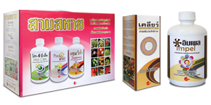 ใช้สามสหาย อย่างละ 200 ซีซี. ผสม อิมเพล อัตรา 100-200 ซีซี. ผสม เคลียร์ อัตรา 100 ซีซี. ต่อน้ำ 200 ลิตรฉีดพ่นทางใบให้เปียกชุ่ม 1 ครั้ง